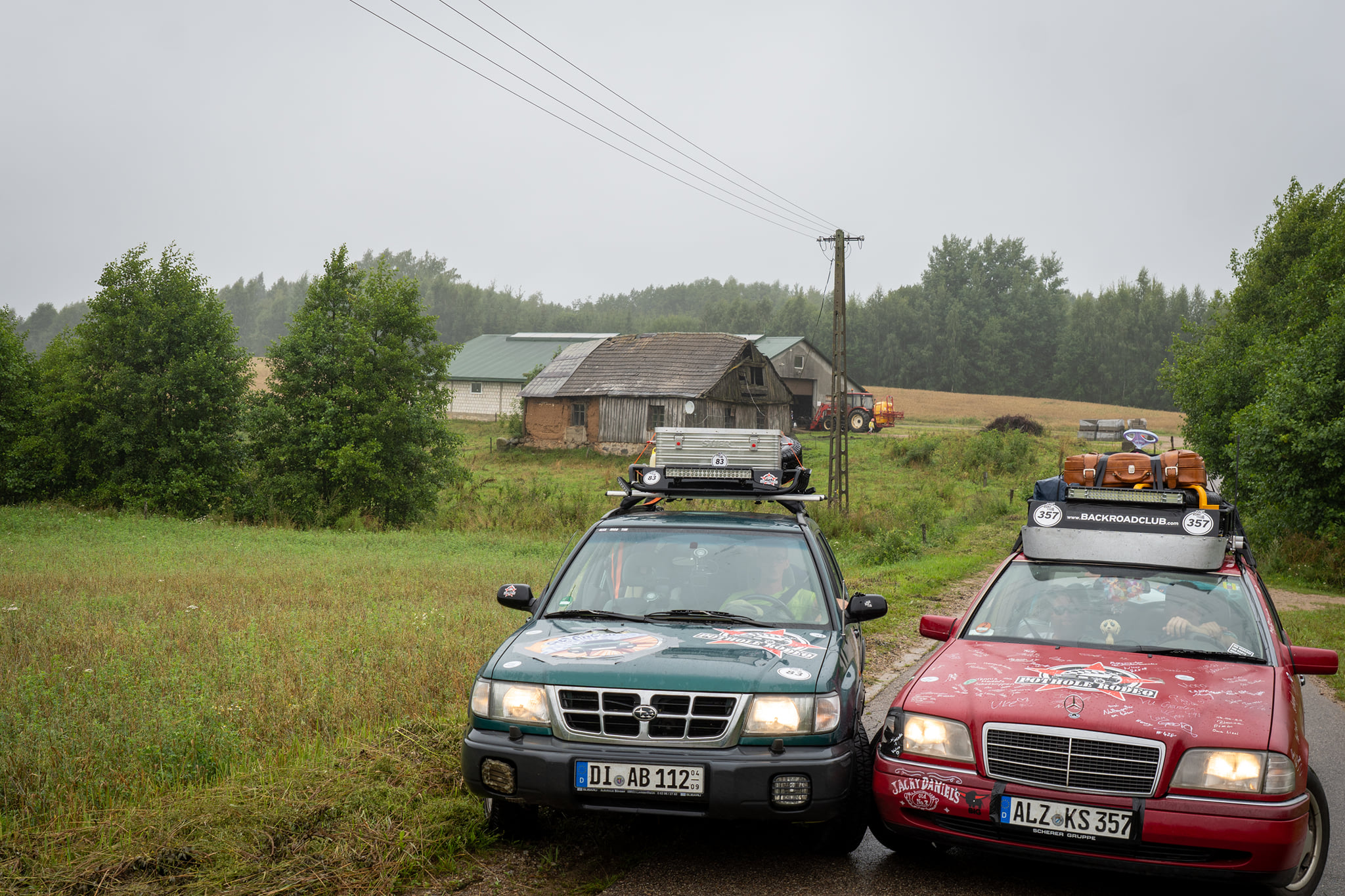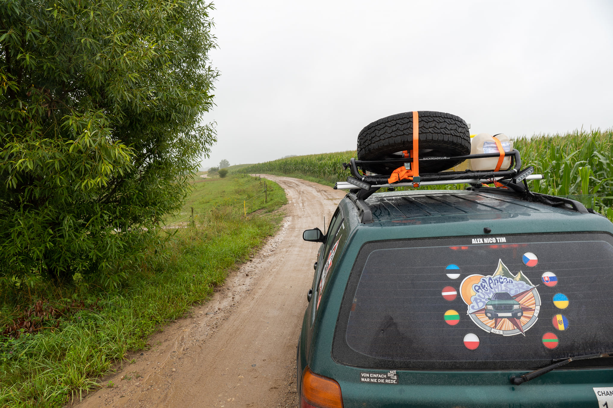 Tag 8: Heute geht es ins Baltikum. Ziel ist ein kleines Dorf in Litauen an der Grenze zu Lettland. Es wird eine unspektakuläre Etappe ohne größere Zwischenfälle. Aber auch das ist ja mal schön. Unser erster Zwischenstopp ist ein kleiner See auf polnischer Seite. Da es in strömen regnet, muss die geplante Pause am Seeufer leider ausfallen und außer Alex will auch niemand so wirklich im See schwimmen.
