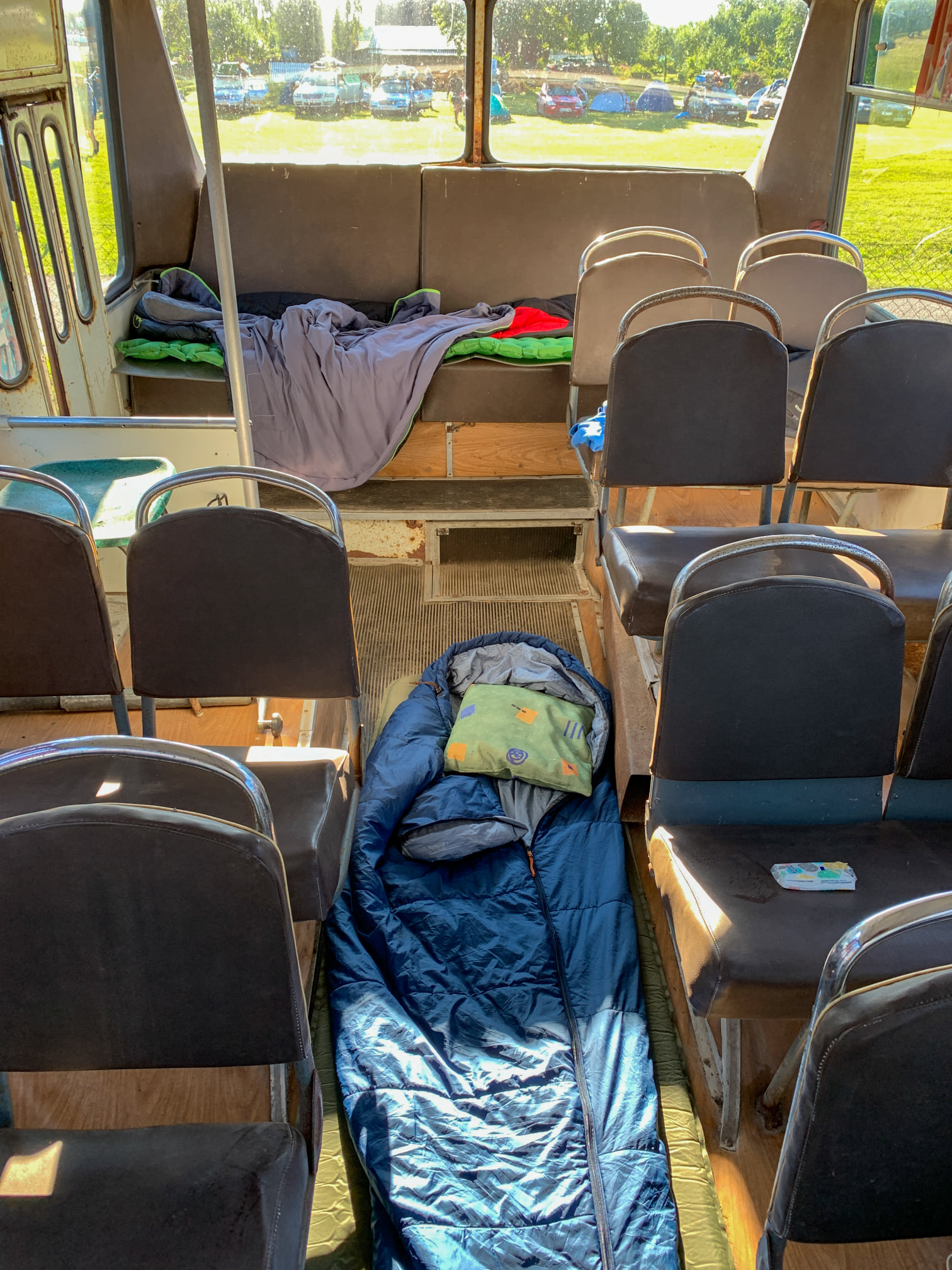 Wir schlafen in dem Wrack eines Reisebusses und sparen uns so das Zeltaufbauen.